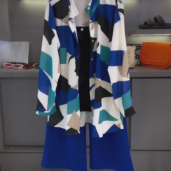 🎨 Eye-catching geometric print – A unique blend of teal, royal blue, black, beige, and white